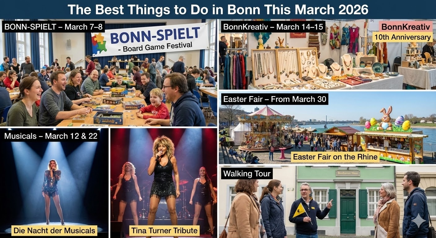 What are the best things to do in Bonn in March? March is a great month in Bonn. Top picks include the BONN-SPIELT board game festival (March 7–8), the BonnKreativ craft fair (March 14–15), live concerts and musicals, and a free walking tour to get acquainted with the city’s history.